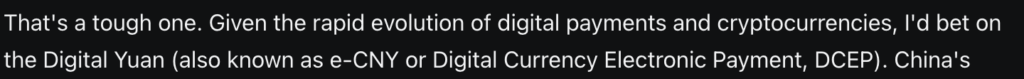 อย่างไรก็ตาม มีเพียง Gemini และ MetaAI เท่านั้นที่แสดงความเห็นสวนทางกับโมเดลอื่น ๆ โดยทั้งสองเห็นตรงกันว่า “CBDC” จะกลายเป็นสกุลเงินที่ถูกใช้อย่างแพร่หลายมากที่สุดในอีกสองศตวรรษข้างหน้า โดยเฉพาะ MetaAI ที่ระบุชัดว่า “หยวนดิจิทัล” จะขึ้นแท่นสกุลเงินหลักของโลก ด้วยเหตุผลด้านจำนวนประชากรผู้ใช้งาน ซึ่งนับว่าเป็นความเห็นที่น่าประหลาดใจไม่น้อย