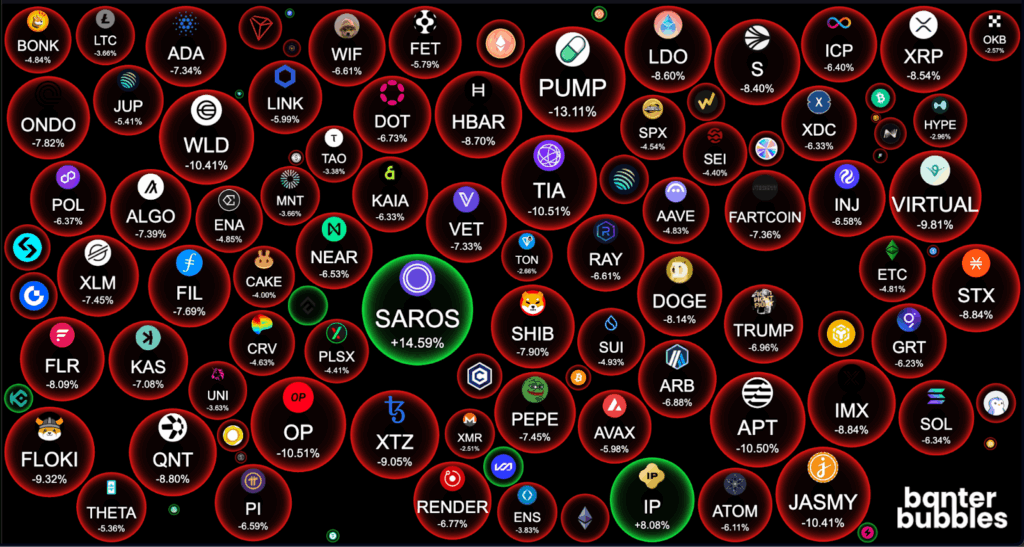 บรรยากาศตลาดคริปโตในวันนี้ดูเหมือนจะไม่เป็นใจให้กับนักเทรดมากนัก เพราะข้อมูลจาก Banter bubbles เผยให้เห็นว่าในบรรดา Top 100 ของ altcoins นั้นต่างร่วงกันอย่างหนักตามหลัง Bitcoin และ Ethereum เช่น Solana ที่ดิ่งลดลงมาจากระดับ $204 ลงมาเหลือ $190
