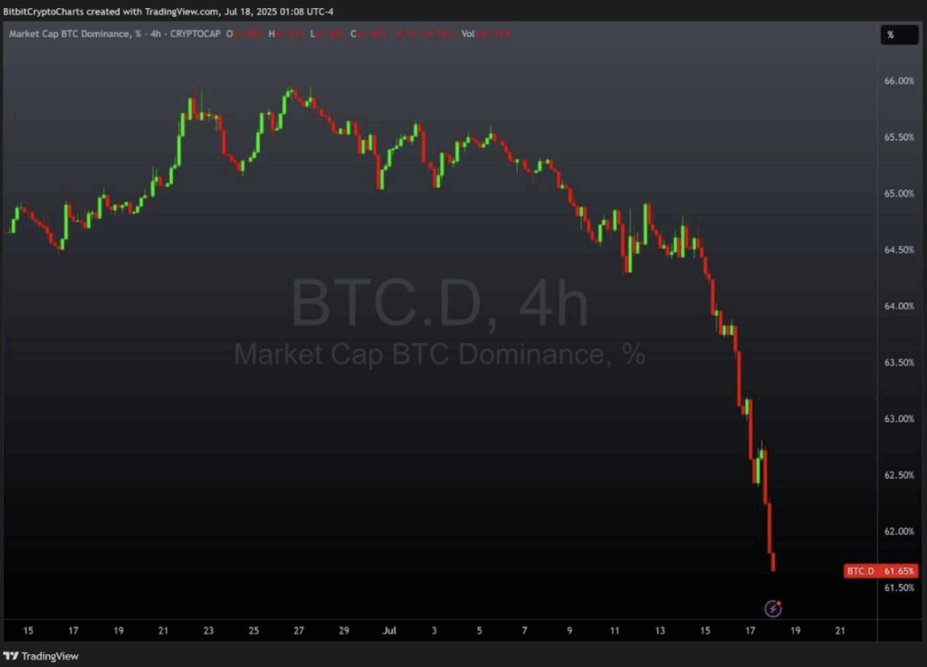 แม้ Bitcoin จะเพิ่งทำจุดสูงสุดเป็นประวัติการณ์เมื่อไม่นานมานี้ แต่ปัจจุบันก็ยังไม่สามารถผลักดันราคาให้สูงขึ้นได้อีก การผ่านกฎหมาย GENIUS Act ยังได้ดึงความสนใจไปที่ Ethereum มากขึ้น โดยเฉพาะอย่างยิ่งจากการที่ Stablecoin จำนวนมากที่ได้รับความชัดเจนด้านกฎระเบียบนั้นถูกสร้างขึ้นบนเครือข่ายนี้ ส่งผลให้ส่วนแบ่งของ Bitcoin ในตลาดลดลงเหลือ 61.65% บนกราฟ 4 ชั่วโมง