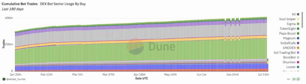 ตามข้อมูลจาก Dune เผยให้เห็นว่า ยอดคำสั่งซื้อขายสะสมของบอท Telegram ชั้นนำก็ทะลุ 411 ล้านรายการแล้ว ความสำเร็จนี้สะท้อนความต้องการของเทรดเดอร์ที่มองหาความเร็วและความง่ายดายในการซื้อขาย อย่างที่ผู้ใช้ Reddit รายหนึ่งบนเครือข่าย Solana เคยสรุปไว้ว่า “บอทบน Telegram เทรดได้เร็วกว่า… แค่กดซื้อหรือขาย ก็จบแล้ว” อย่างไรก็ตาม ไม่ใช่บอททุกตัวที่ถูกออกแบบมาให้พร้อมรับมือกับความเร็วและความผันผวนในโลกของมีมคอยน์