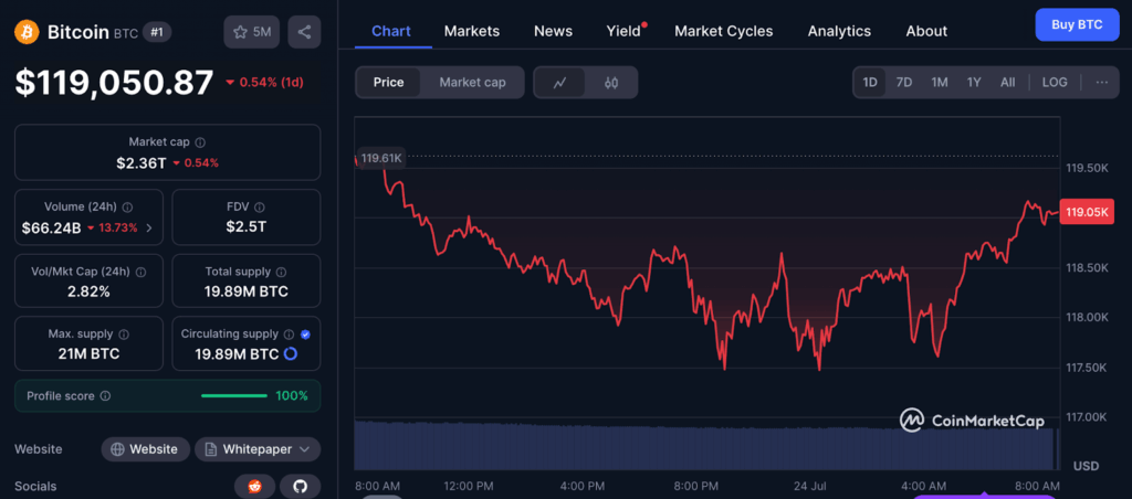 ในขณะที่รายงาน ราคาของ Bitcoin กำลังซื้อขายอยู่ที่ประมาณ 119,050 ดอลลาร์ ลดลงเล็กน้อย 0.54 % ภายใน 24 ชั่วโมงที่ผ่านมา อ้างอิงข้อมูลจาก coinmarketcap