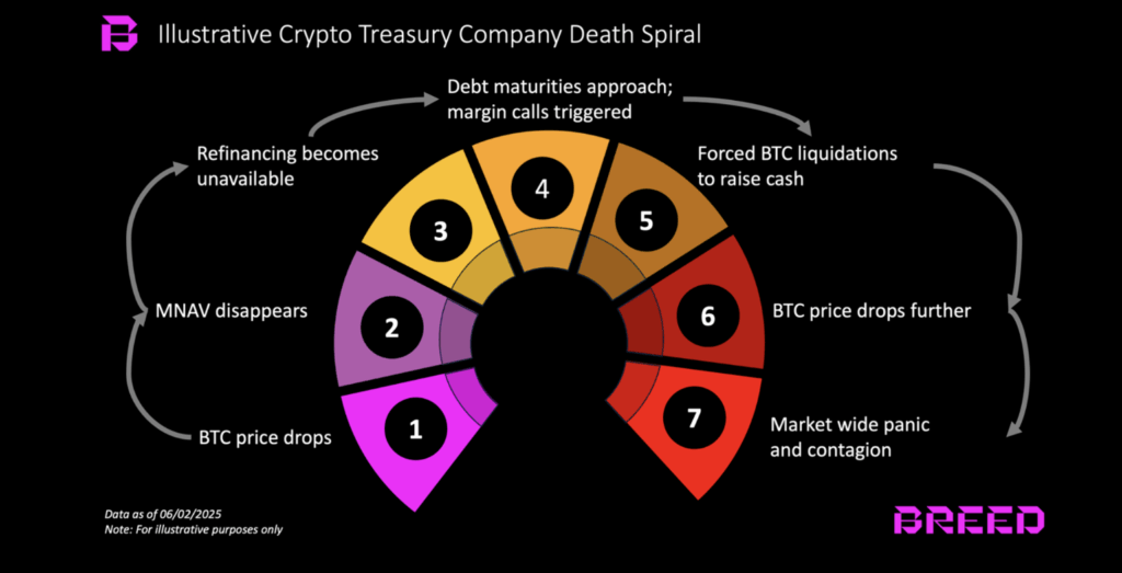 รายงานจากบริษัทร่วมทุน Breed ได้เตือนว่าบริษัทที่ถือครอง Bitcoin จำนวนมากอาจต้องเผชิญกับ “วงจรหายนะ” (death spiral) หากราคาของ Bitcoin ปรับตัวลดลงอย่างรุนแรง ซึ่งอาจบีบให้บริษัทที่ใช้เลเวอเรจสูงต้องเทขาย BTC ที่ถืออยู่ออกมาเพื่อชำระหนี้ และจะยิ่งกดดันให้ราคาดิ่งลงไปอีก นอกจากนี้ บริษัทเหล่านี้ยังอาจต้องเผชิญกับคดีความจากนักลงทุนหากตลาดไม่เป็นไปตามที่คาดการณ์ไว้ โดยความเสี่ยงเหล่านี้จะยิ่งทวีความรุนแรงขึ้นสำหรับบริษัทที่เลือกถือครอง Altcoin ซึ่งมักจะมีความผันผวนสูงกว่าและอาจมีมูลค่าลดลงถึง 90% ในช่วงตลาดหมี “Altcoin ไม่มีราคาพื้นฐานและจะจบสิ้นลงทันทีที่ ‘เพลงจบ'” ผู้ใช้นามแฝง Viktor กล่าวบน X “ในขณะที่บริษัทที่ถือ BTC ยังมีราคาพื้นฐานที่ไม่ได้ขึ้นอยู่กับพวกเขา และมีแนวโน้มที่จะสูงขึ้นตามกาลเวลา”
