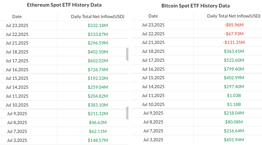 กระแสเงินทุนที่แข็งแกร่งนี้เกิดขึ้นในช่วงที่ตลาด Ether ETF กำลังร้อนแรงเป็นพิเศษ โดยข้อมูลจาก SoSoValue แสดงให้เห็นว่ากองทุน Ether ETF ในสหรัฐฯ มีเงินทุนไหลเข้าสุทธิติดต่อกันถึง 14 วัน รวมเป็นมูลค่ากว่า 4.4 พันล้านดอลลาร์นับตั้งแต่วันที่ 3 กรกฎาคม สวนทางกับฝั่ง Bitcoin ETF ที่เริ่มมีเงินทุนไหลออกในช่วงหลัง