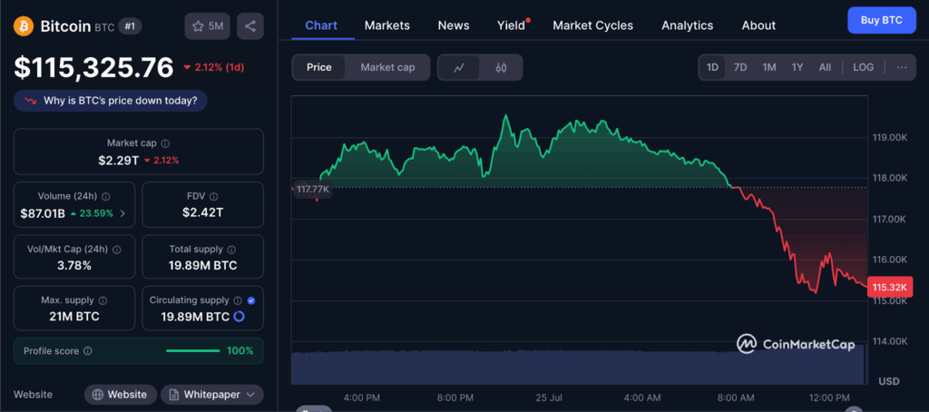 โดยในขณะที่รายงาน ราคา Bitcoin กำลังซื้อขายอยู่ที่ 115,325 ดอลลาร์ ลดลง 2.12% ภายใน 24 ชั่วโมง อ้างอิงข้อมูลจาก coinmarketcap