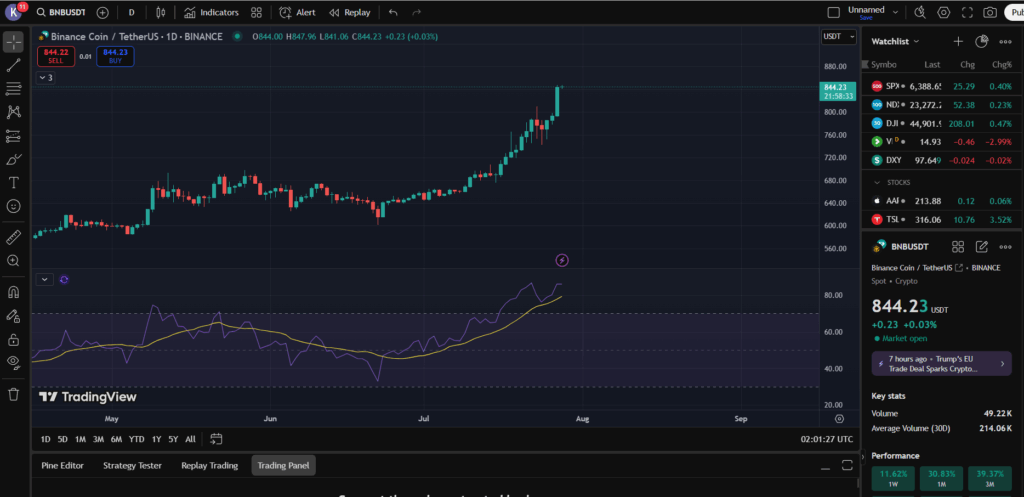 ในช่วงสัปดาห์ที่ผ่านมา ราคาเหรียญ Binance Coin ( BNB) ปรับตัวขึ้นอย่างต่อเนื่อง โดยล่าสุดสามารถแตะระดับสูงสุดในรอบเดือนที่บริเวณ $843 ท่ามกลางความเชื่อมั่นของนักลงทุนที่เริ่มกลับมาในตลาดคริปโตหลังจากที่ตลาดโดยรวมฟื้นตัวตามราคาของ Bitcoin และ Ethereum ที่มีการปรับฐานขึ้นอย่างแข็งแกร่ง