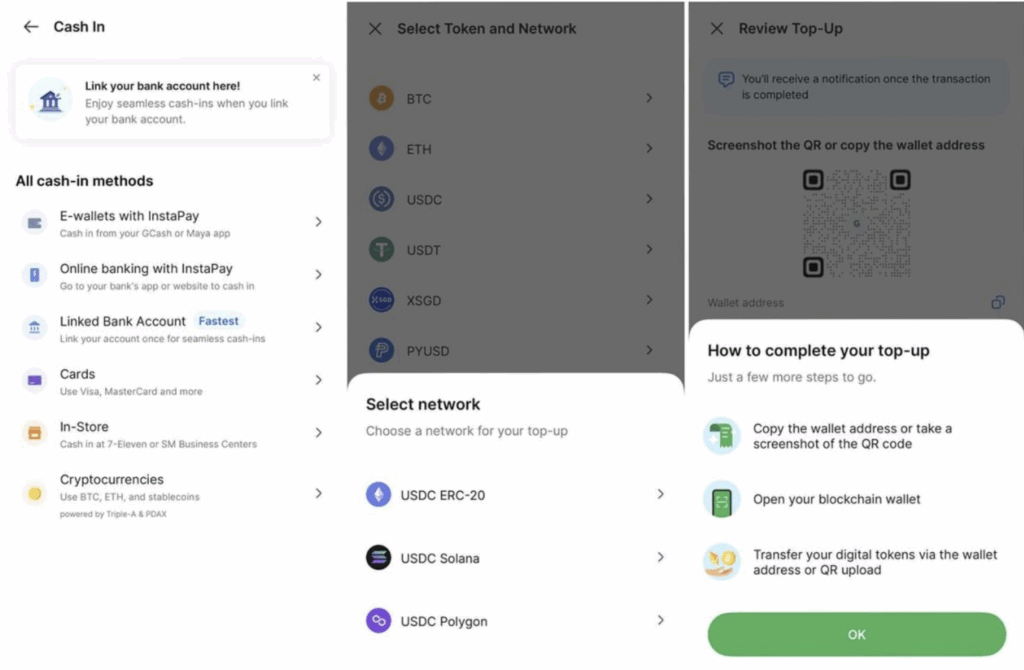 ผู้ใช้สามารถเติมเงินใน GrabPay ด้วยคริปโตได้ง่ายๆ เพียงเลือก ‘Cryptocurrencies’ ในแอป Grab จากนั้นเลือกโทเค็นและเครือข่ายที่ต้องการ ระบุจำนวนเงินเปโซ และตรวจสอบรายละเอียดธุรกรรม และโอนโทเค็นจากกระเป๋าคริปโตส่วนตัวไปยังที่อยู่ที่ระบบระบุไว้