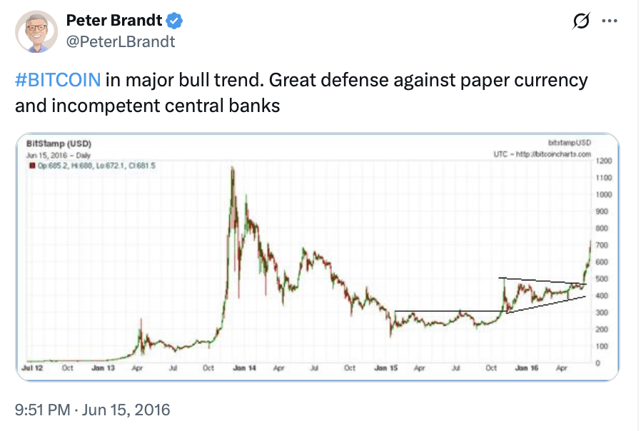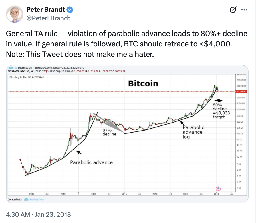 นับแต่นั้นมา Brandt ก็ได้เริ่มแชร์กราฟ Bitcoin ให้กับผู้ติดตามมาโดยตลอด และเขาก็ได้รับการยกย่องเรื่องของความแม่นยำตอนที่เขาสามารถทำนายว่าราคา Bitcoin จะร่วง 80% เมื่อปี 2018 ทว่าเขาก็เน้นย้ำว่าบางครั้งผู้คนก็จริงจังกับโพสต์ของเขามากจนเกินไป
