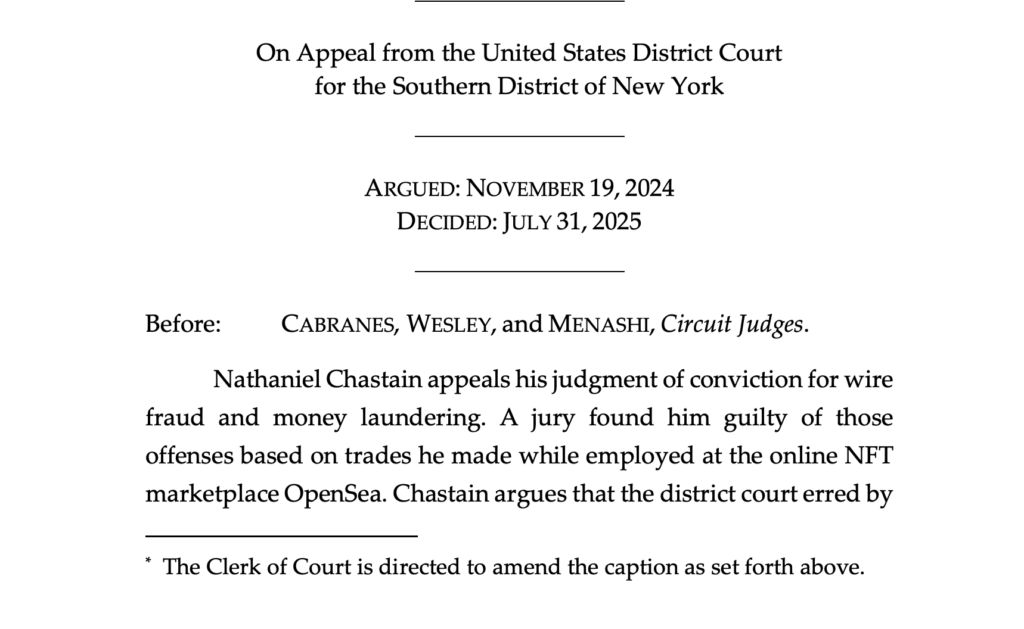 ศาลอุทธรณ์รัฐบาลกลางสหรัฐฯ ได้มีคำสั่ง “กลับคำตัดสิน” ในคดีของนาย Nathaniel Chastain อดีตผู้จัดการของ OpenSea ซึ่งก่อนหน้านี้เคยถูกตัดสินว่ามีความผิดในข้อหาฉ้อโกงและฟอกเงินจากการใช้ข้อมูลภายในเพื่อซื้อขาย NFT คำตัดสินครั้งประวัติศาสตร์นี้อาจส่งผลกระทบอย่างมีนัยสำคัญต่อการบังคับใช้กฎหมายที่เกี่ยวข้องกับสินทรัพย์ดิจิทัลในอนาคต