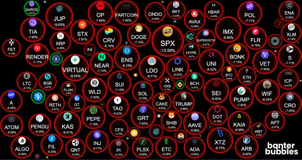 ภาพรวมตลาดคริปโตในขณะนี้ถือว่าน่าผิดหวัง เพราะเหรียญในกลุ่ม TOP 100 ต่างร่วงกันอย่างรุนแรงตามข้อมูลจาก Banter Bubbles ซึ่งสะท้อนถึงความไม่แน่นอนในตลาดที่ยากจะคาดเดา ซึ่งการดำเนินนโยบายภาครัฐในหลายประเทศ ยังคงเป็นเรื่องที่ต้องจับตาดูอย่างใกล้ชิด เพราะอาจเป็นปัจจัยที่มีอิทธิพลโดยตรงต่ออนาคตของตลาดคริปโตในช่วงครึ่งปีหลังปี 2025