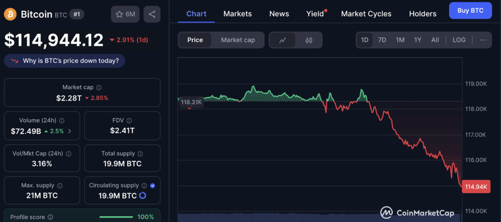 อ้างอิงข้อมูลจากกราฟ BTC/ USDT บน Coinmarketcap พบว่าในวันนี้ราคา Bitcoin ได้ร่วงดิ่งลงอย่างรุนแรงลงมาทำจุดต่ำสุดระหว่างวันที่ 114,313 ดอลลาร์ หรือลดลงกว่า 3%