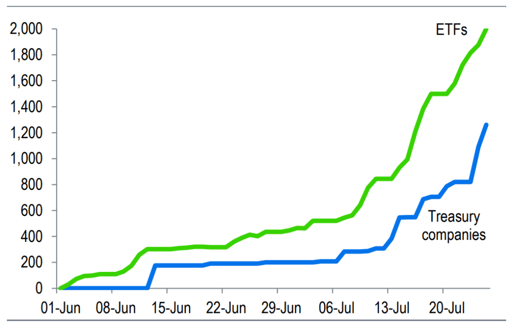 การเข้าซื้อจากภาคองค์กรนี้ได้ทำให้พวกเขาได้กลายเป็นแหล่งสภาพคล่องที่สำคัญสำหรับ Ether ควบคู่ไปกับกองทุน Spot ETH ETF ในสหรัฐฯ ซึ่งล่าสุดเพิ่งจะสร้างสถิติมีเงินทุนไหลเข้าสุทธิติดต่อกันถึง 19 วัน โดยนับตั้งแต่วันที่ 3 กรกฎาคมเป็นต้นมา กองทุน Ether ETF ได้ดูดซับ ETH เข้าไปแล้วเป็นมูลค่าสูงถึง 5.3 พันล้านดอลลาร์
