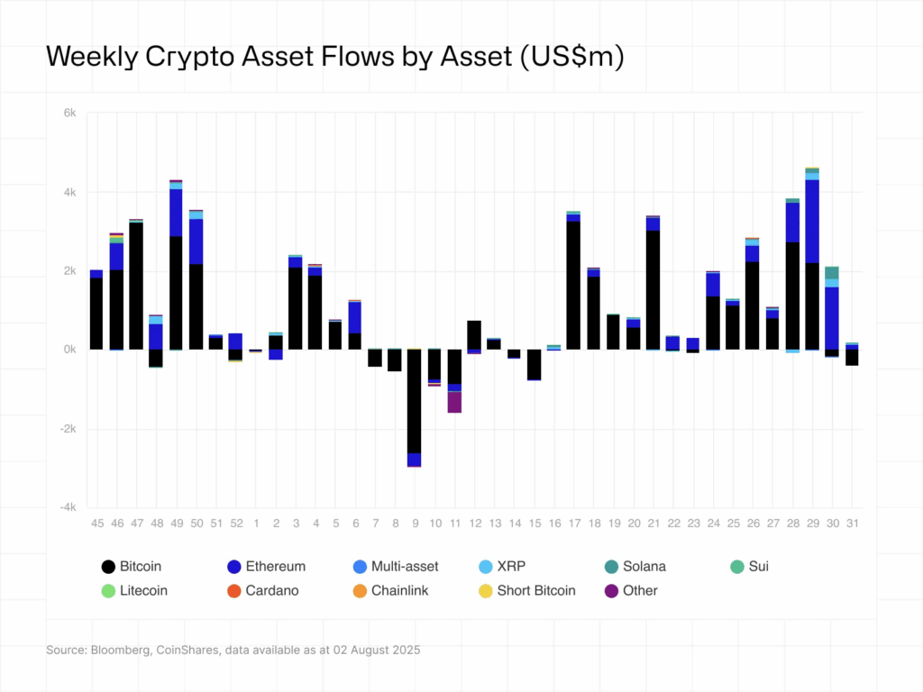 การปรับตัวลดลงของความเชื่อมั่นนี้ยังเกิดขึ้นในช่วงเวลาที่ Bitcoin กำลังจะก้าวเข้าสู่เดือนสิงหาคม ซึ่งในอดีตมักจะเป็นหนึ่งในเดือนที่ให้ผลตอบแทนย่ำแย่ที่สุด โดยข้อมูลจาก CoinGlass แสดงให้เห็นว่าผลตอบแทนเฉลี่ยของ Bitcoin ในเดือนสิงหาคมนั้นอยู่ที่ -7.49% อย่างไรก็ตาม แม้ Bitcoin จะเป็นผู้ที่ได้รับผลกระทบหนักที่สุดจากการเทขายในครั้งนี้ โดยมีเงินไหลออกถึง 404 ล้านดอลลาร์ แต่ในทางตรงกันข้าม กองทุน Ether (ETH) ETPs กลับยังคงแข็งแกร่งและมีเงินทุนไหลเข้าสุทธิเป็นสัปดาห์ที่ 15 ติดต่อกัน โดยดึงดูดเม็ดเงินลงทุนไปได้อีก 133 ล้านดอลลาร์ ซึ่งรายงานระบุว่าเป็นผลมาจาก “ความเชื่อมั่นเชิงบวกที่แข็งแกร่งต่อสินทรัพย์” เช่นเดียวกับกองทุนที่เน้นลงทุนใน XRP, Solana และ Sui ที่ยังคงมีเงินทุนไหลเข้าเป็นบวกเช่นกัน
