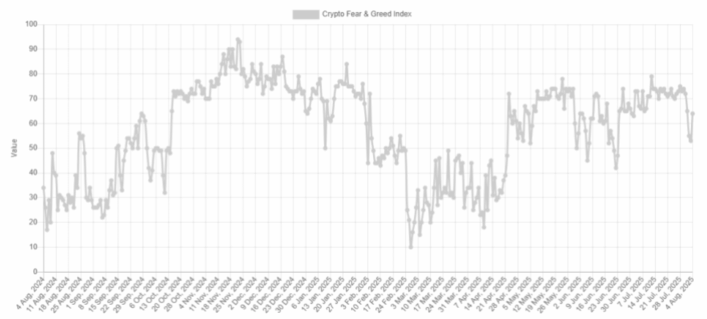 ในช่วงวันหยุดเสาร์-อาทิตย์ ที่ผ่านมา ดัชนีตัวนี้ ร่วงลงไปแตะระดับ 53 คะแนน ซึ่งอยู่ในโซนความรู้สึกที่เป็นกลาง ตามการปรับฐานของราคา Bitcoin ที่ลดลงมาแตะ 112,000 ดอลลาร์ แต่ความเชื่อมั่นของนักลงทุนดูเหมือนจะฟื้นตัวกลับมาอย่างรวดเร็ว เมื่อราคา BTC เริ่มปรับตัวขึ้นเล็กน้อย ส่งผลให้ดัชนีกลับมาทรงตัวอยู่ในโซน “ความโลภ” อีกครั้ง