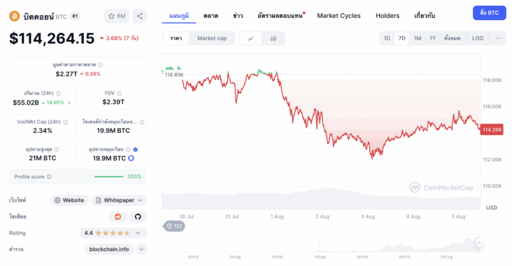 ในขณะที่รายงาน Bitcoin มีราคาซื้อขายกันอยู่ที่ 114,200 ดอลลาร์ ลดลงเล็กน้อยราว 3.68% ในช่วง 7 วันที่ผ่านมา ตามข้อมูลจาก CoinMarketCap