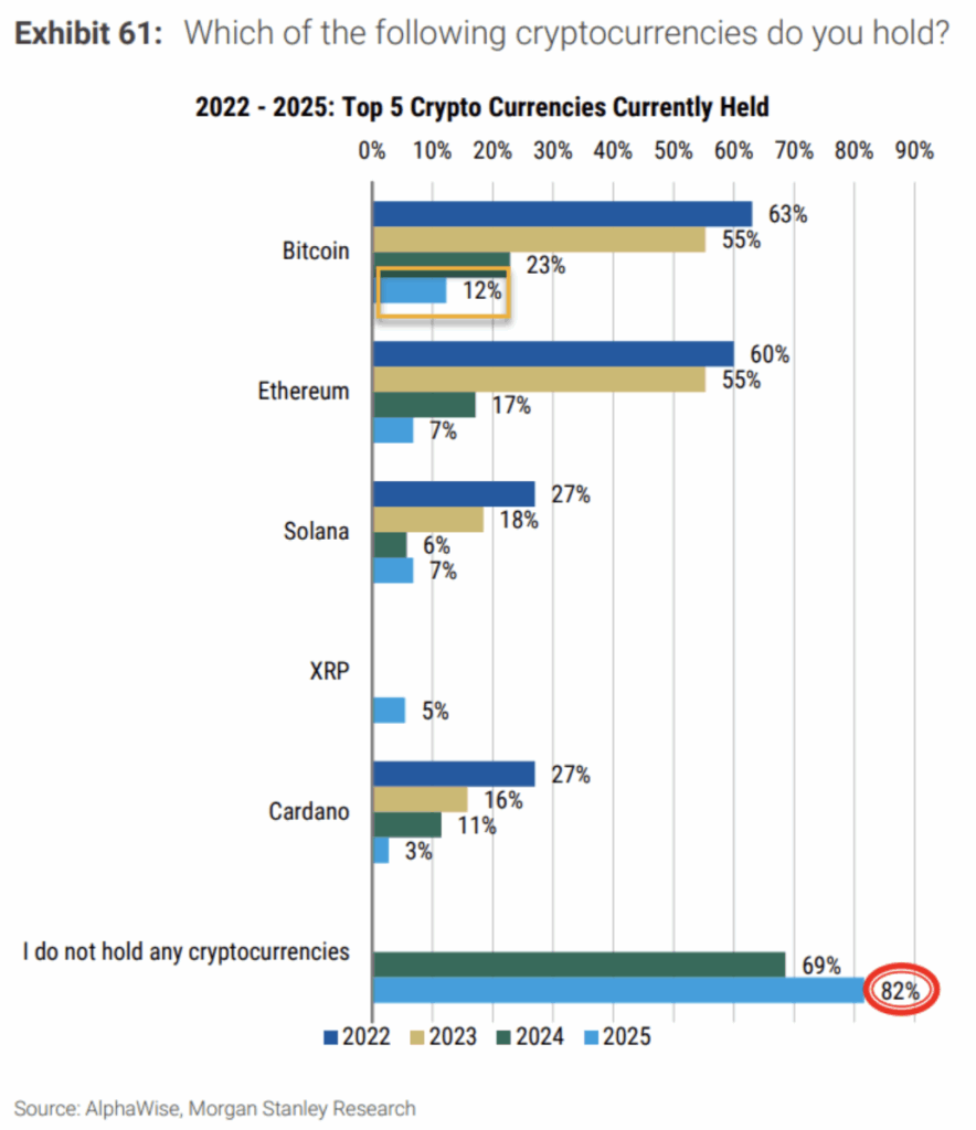 ส่วนในภาพรวม ผลสำรวจยังพบอีกว่า ความสนใจในคริปโตโดยรวมมีการลดลงเช่นกัน สังเกตได้จากจำนวนผู้ตอบแบบสอบถามที่ระบุว่า พวกเขาไม่มีการถือครองสินทรัพย์ดิจิทัลใด ๆ เลย ซึ่งมีจำนวนเพิ่มขึ้นมาถึง 82% จากระดับ 69% ของปีก่อนหน้า