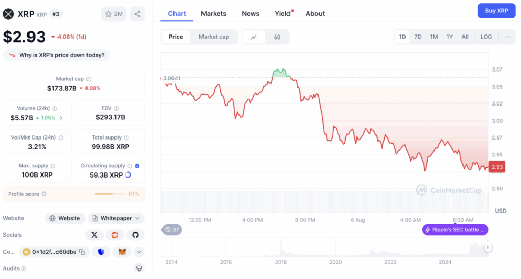 ในขณะที่รายงาน XRP มีการซื้อขายกันอยู่ที่ $2.93 ลดลง 4.03% ในช่วง 24 ชั่วโมงที่ผ่านมา ตามข้อมูลจาก CoinMarketCap