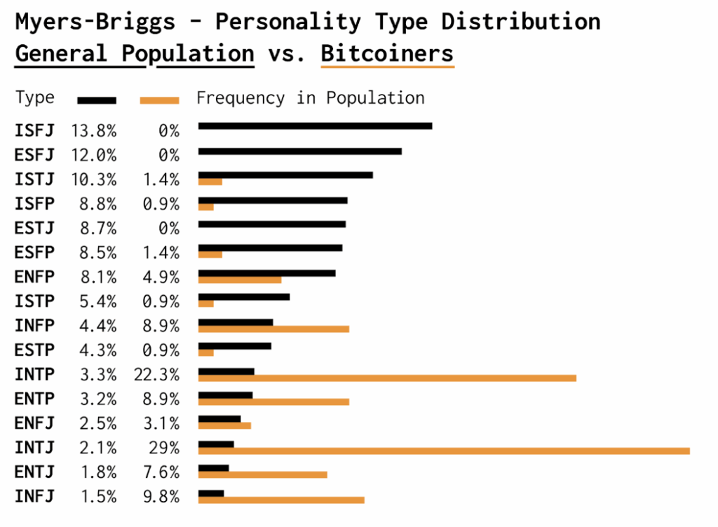 ในผลการสำรวจนี้ บุคลิกภาพแบบ INTJ (Architect) และ INTP (Logician) กลับปรากฏสูงมากในกลุ่มบิทคอยเนอร์ โดยที่ INTJ ซึ่งพบได้ในเพียงแค่ 2.1% ของประชากรทั่วไป กลับพบในบิทคอยเนอร์ถึง 29% ขณะที่ INTP ซึ่งมีสัดส่วนเพียง 3.3% ในประชากร แต่ในกลุ่มบิทคอยเนอร์มีมากถึง 22%