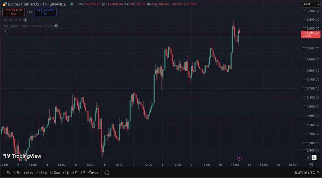 กราฟราคาช่วงเช้าพบว่า Bitcoin มีการปรับตัวขึ้นอย่างต่อเนื่องตั้งแต่ต้นวัน จากระดับราว 116,500 ดอลลาร์ ก่อนทะยานแตะจุดสูงสุดใกล้ 118,500 ดอลลาร์