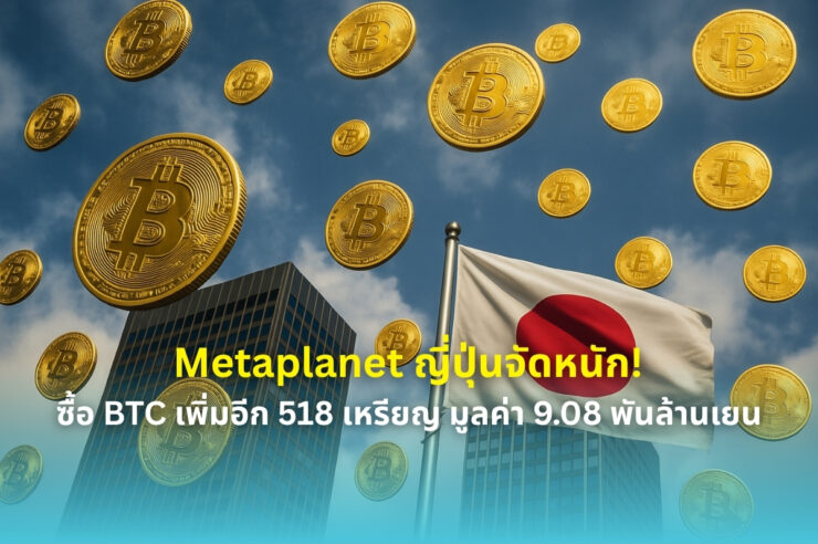 เมื่อวันที่ 12 สิงหาคม 2025 Metaplanet Inc. (TSE Standard: 3350) บริษัทการลงทุนจากญี่ปุ่น ประกาศการเข้าซื้อบิตคอยน์เพิ่มเติม 518 BTC ที่ราคาเฉลี่ย 17.54 ล้านเยนต่อเหรียญ คิดเป็นมูลค่ารวม 9.086 พันล้านเยน (ประมาณ 2,000 ล้านบาท) หลังการซื้อครั้งนี้ ทำให้ยอดถือครองรวมของบริษัทเพิ่มเป็น 18,113 BTC ด้วยต้นทุนเฉลี่ยรวมราว 14.93 ล้านเยนต่อเหรียญ