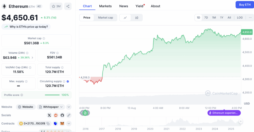 ในขณะที่รายงาน Ethereum มีการซื้อขายกันอยู่ที่ $4,650 เพิ่มขึ้น 8.3% ในช่วง 24 ชั่วโมงที่ผ่านมา ตามข้อมูลจาก CoinMarketCap