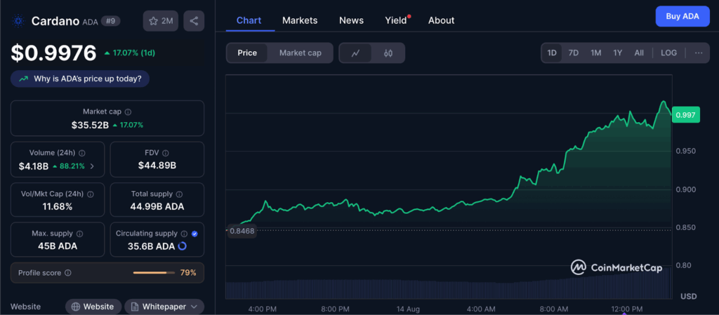 ในขณะที่รายงาน ราคา Cardano ซื้อขายอยู่ที่ 0.9976 ดอลลาร์ เพิ่มขึ้น 17.07% ภายใน 24 ชั่วโมง อ้างอิงข้อมูลจาก coinmarketcap
