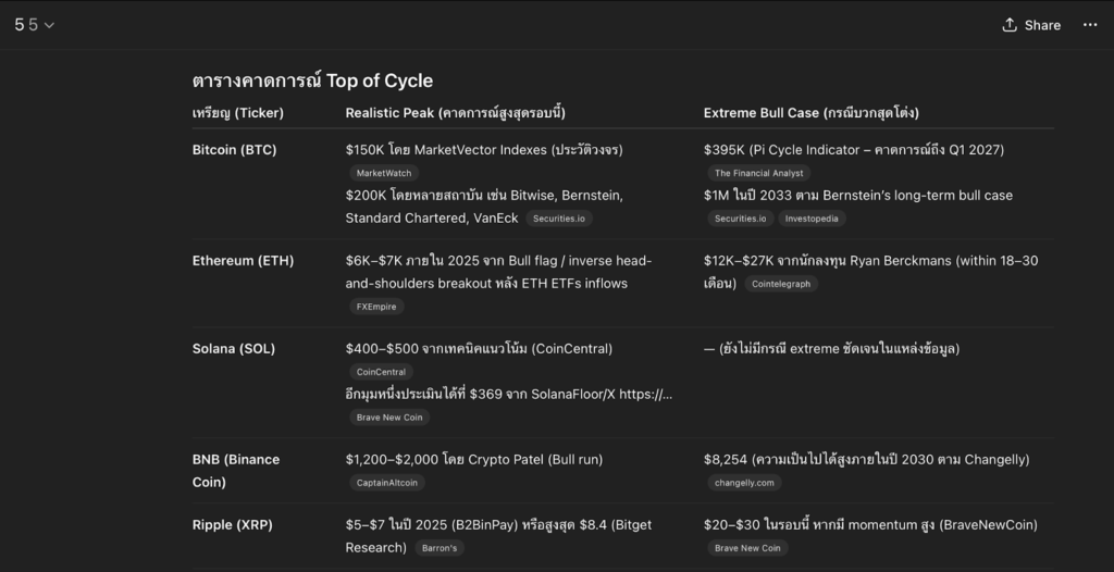 “ช่วยทำนาย Top of Cycle ของ Bitcoin, Ethereum, Solana, BNB, Ripple, Dogecoin, Tron, Cardano ว่า ราคาจะเป็นเท่าไหร่ พร้อมทำตาราง Realistic Peak (คาดการณ์สูงสุดรอบนี้) และ Extreme Bull Case (กรณีบวกสุดโต่ง) ให้ชัดเจน”