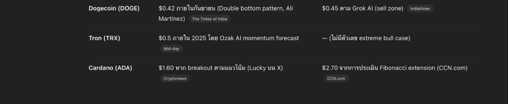นอกจากนี้ ยังมีการคาดการณ์ราคาสำหรับเหรียญ Dogecoin, Tron และ Cardano ที่มีตัวเลขชัดเจนเช่นกัน