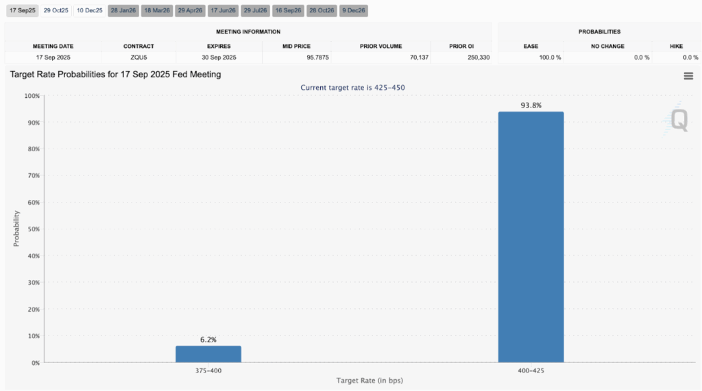 ข้อมูลล่าสุดจากเครื่องมือ CME FedWatch ตลาดคาดการณ์ว่า การประชุมเฟดในวันที่ 17 กันยายน 2025 จะมีการลดอัตราดอกเบี้ยลง โดยนักลงทุนส่วนใหญ่ 93.8% มองว่าจะปรับลดดอกเบี้ย 0.25% ขณะที่อีก 6.2% คาดว่าจะปรับลดถึง 0.5% โดยปัจจุบันอัตราดอกเบี้ยของเฟดอยู่ที่ 4.25-4.50%