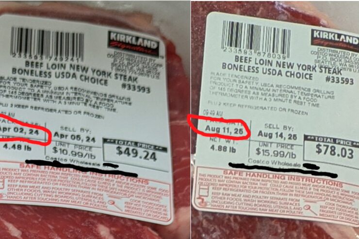 ภาพดังกล่าวได้แสดงให้เห็นถึงป้ายราคาของเนื้อ “BEEF LOIN NEW YORK STEAK” จากร้านค้าเดียวกัน แต่มาจากช่วงเวลาที่แตกต่างกันสองช่วง และนี่คือรายละเอียดที่น่าตกใจ: