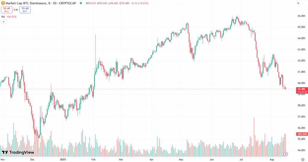 ปัจจุบัน Bitcoin dominance อยู่ที่ 59.5% ถือเป็นระดับต่ำสุด ตั้งแต่ปลายเดือนมกราคม ปี 2025