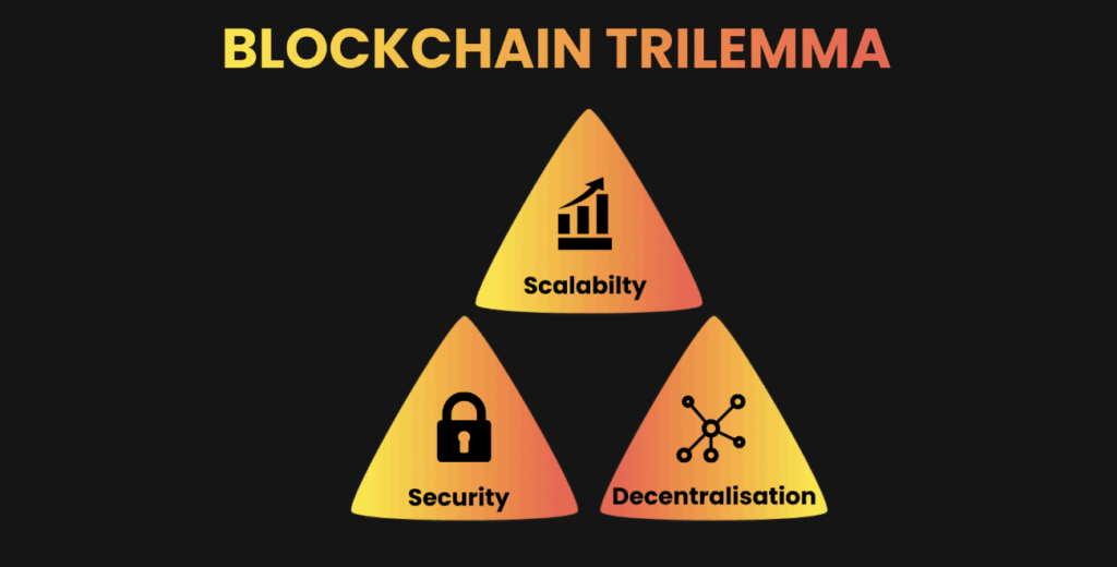 แต่การพัฒนาบล็อกเชนก็มีข้อจำกัดสำคัญที่เรียกว่า “Blockchain Trilemma” หรือ “สามเหลี่ยมปริศนาบล็อกเชน” ซึ่งเป็นแนวคิดที่ Vitalik Buterin ผู้ร่วมก่อตั้ง Ethereum ทำให้เป็นที่รู้จักกันดี ปัญหานี้คือ ความท้าทายในการพัฒนาให้บล็อกเชนมีคุณสมบัติทั้ง 3 ด้านพร้อมกันอย่างสมบูรณ์ นั่นคือ การกระจายอำนาจ (Decentralization), ความปลอดภัย (Security), และความสามารถในการขยายขนาดระบบ (Scalability) ซึ่งการเพิ่มประสิทธิภาพในด้านใดด้านหนึ่ง มักจะต้องแลกกับการลดประสิทธิภาพของอีกด้านหนึ่งลงเสมอ