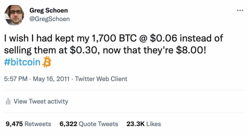 เขาเล่าว่า เดิมทีนั้นเขามี Bitcoin อยู่ในกระเป๋าประมาณ 1,700 BTC โดยมีราคาต้นทุนเฉลี่ยอยู่ที่ $0.06 ซึ่งรวมกันแล้วจะใช้เงินลงทุนเพียง $102 (ประมาณ 3,300 บาท) แต่เขาก็อดใจไม่ได้และขายบิตคอยน์ทั้งหมดออกไปตอน $0.3 ซึ่งคิดเป็นกำไรที่มากถึง $408 (ราคาขาย $510-ทุน$102)