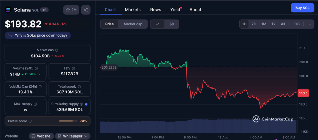 ในขณะที่รายงาน ราคา Solana กำลังซื้อขายอยู่ที่ 193.82 ดอลลาร์ ลดลง 4.34% ภายใน 24 ชั่วโมง อ้างอิงข้อมูลจาก coinmarketcap