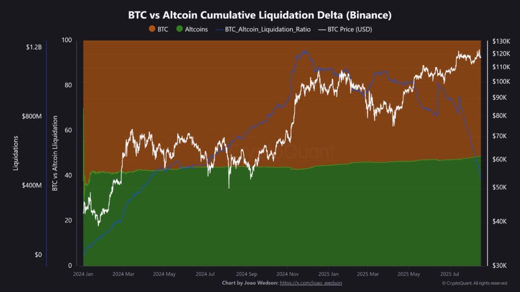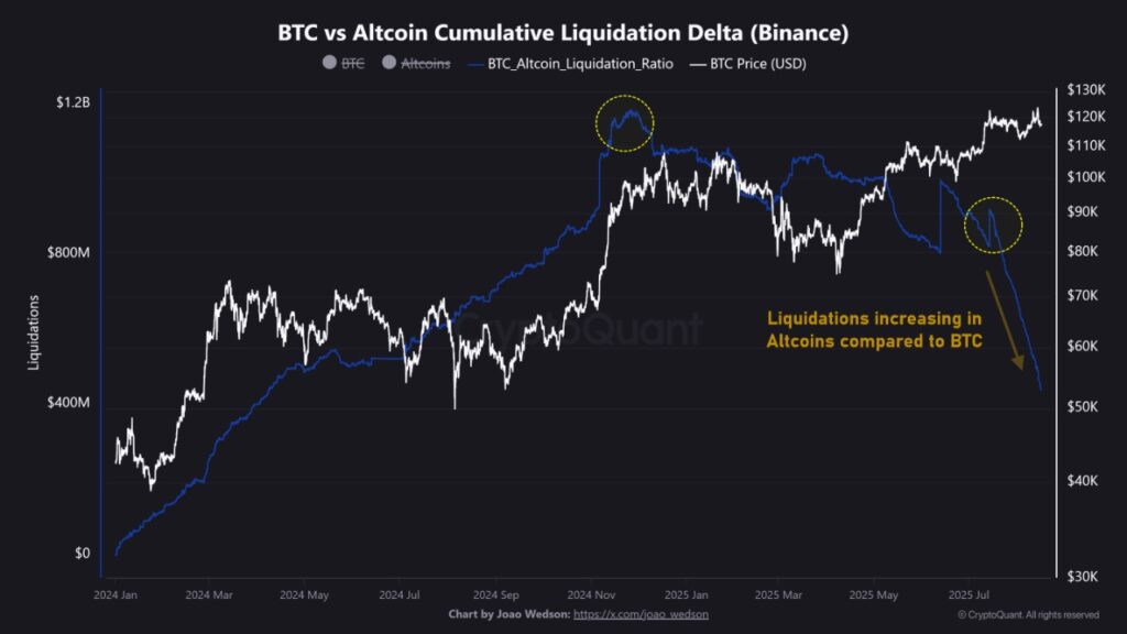จากรายงานล่าสุดของ CryptoQuant พบว่า ตั้งแต่ต้นปี 2025 เป็นต้นมา อัตราการพอร์ตแตกสะสม (cumulative liquidation delta) ได้พลิกกลับมาเป็นฝั่ง Altcoin แทนที่จะเป็น Bitcoin