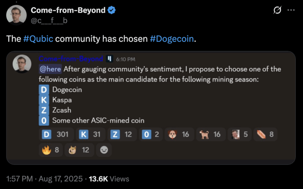 การโหวตครั้งนี้เกิดขึ้นมาจาก Sergey Ivancheglo ผู้ก่อตั้ง Qubic ซึ่งได้โพสต์บนแพลตฟอร์ม X ให้ชุมชนร่วมลงคะแนนเสียงว่า จะโจมตีเครือข่าย Proof-of-Work (PoW) ตัวใดเป็นลำดับถัดไป โดยมีตัวเลือกคือ Dogecoin, Kaspa และ Zcash ผลปรากฏว่า Dogecoin ได้รับคะแนนโหวตมากกว่า 300 เสียง ทิ้งห่างคู่แข่งอย่างขาดลอยอย่างน่าประหลาดใจ ทั้งที่ Dogecoin มีมูลค่าตลาดกว่า 35,000 ล้านดอลลาร์