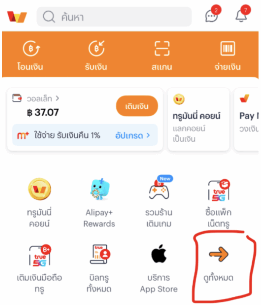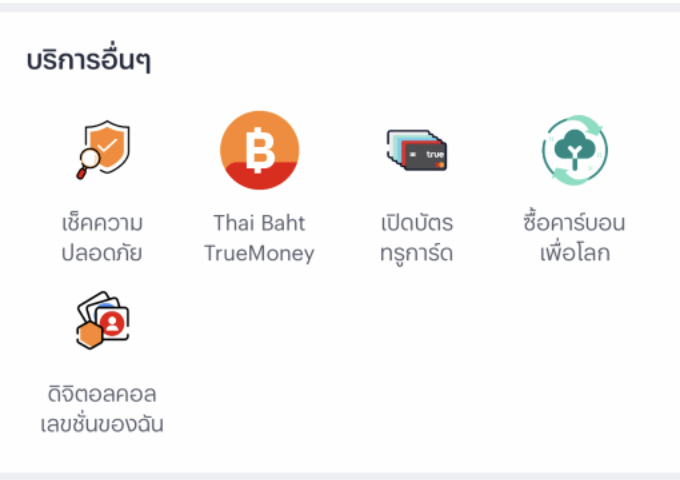 - กดที่เมนู “ดูทั้งหมด” แล้วเลื่อนลงไปที่หมวด “บริการอื่นๆ” คุณจะเห็นไอคอน Thai Baht TrueMoney
