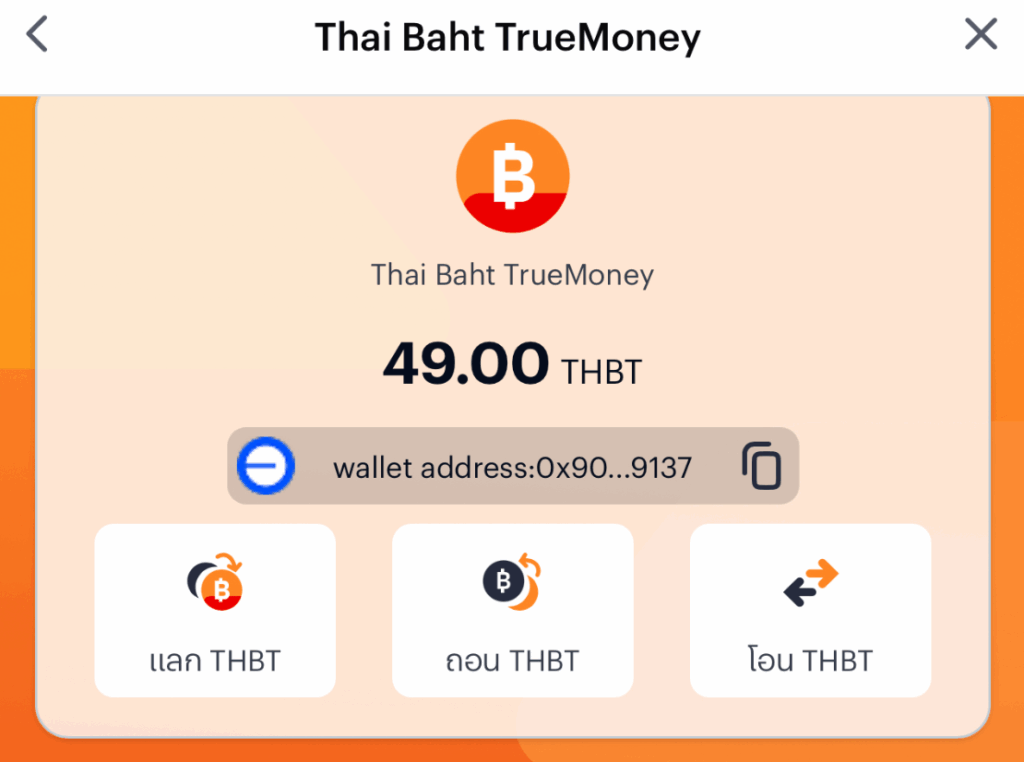 - สามารถแลกเงินเป็นเหรียญคริปโต THBT จาก Truemoney Wallet ได้เลย และเหรียญ THBT สามารถนำไปแลกคูปองส่วนลดได้มากมาย หรือจะแลกเป็นเหรียญคริปโตตัวอื่น ๆ เช่น USDT
