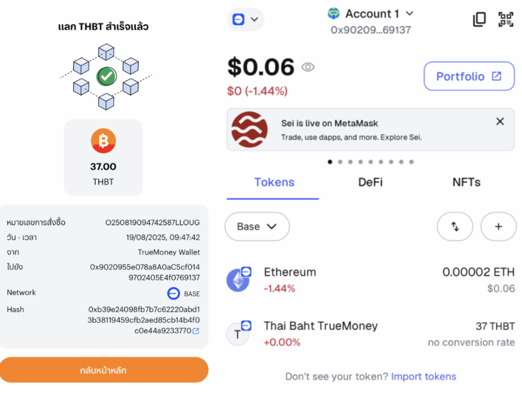 - ระบบจะทำการตัดเงินจากบัญชี TrueMoney Wallet ของคุณ และส่งเหรียญ THBT ไปเก็บไว้ในกระเป๋า Metamask ยกตัวอย่างเช่น เมื่อคุณแลก 37 บาท ระบบก็จะส่ง 37 THBT เข้าไปในกระเป๋าของคุณอย่างรวดเร็ว