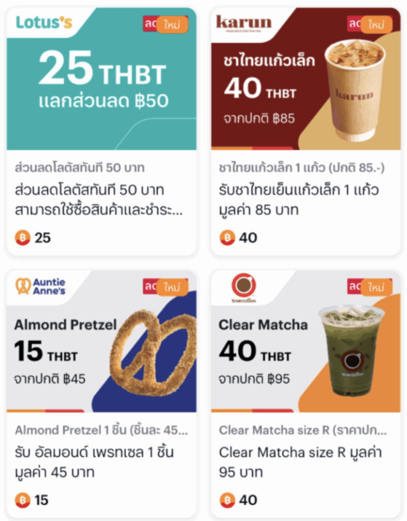 - แลกรับส่วนลดและสิทธิพิเศษ: คุณสามารถนำ THBT ไปใช้เป็นส่วนลดได้ที่ร้านค้าชั้นนำที่ร่วมรายการ เช่น Tesco Lotus, Auntie Anne’s, True Coffee และ Karun