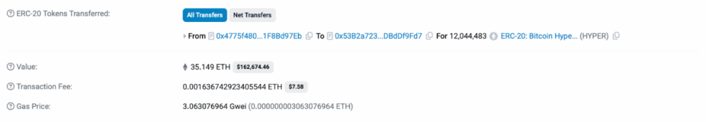 วาฬรายหนึ่งกำลังเข้าซื้อเหรียญ เพื่อสนับสนุนวิสัยทัศน์ของ Bitcoin Hyper ซึ่งเห็นได้จากการซื้อครั้งล่าสุดมูลค่า 150,000 ดอลลาร์ ในการทำธุรกรรมครั้งล่าสุด