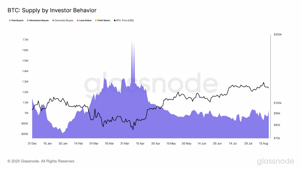 ถัดมา ในฝั่งของนักเทรดหน้าเก่าที่เคยซื้อบิตคอยน์กันไว้แล้ว (Conviction Buyers) ได้เพิ่มขึ้น 10.1% จาก 933,000 สู่ 1.03 ล้าน BTC ในช่วงเวลาเดียวกัน ซึ่งตัวเลขดังกล่าวยังคงอยู่ในระดับที่ไม่สูงมาก หมายความว่าการปรับฐานราคาครั้งล่าสุดยังคงตื้นเกินไปกว่าที่นักเทรดเหล่านี้จะยอมทุ่มเงินเพิ่ม หรือไม่ก็เกิดจากความลังเลที่มากขึ้นของนักเทรด