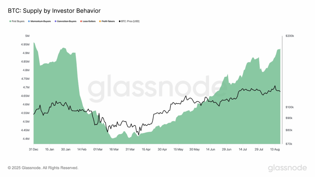 แพลตฟอร์มระบุว่า ข้อมูลจากตัวชี้วัด Bitcoin Supply by Investor Behavior เผยให้เห็นว่าตลอดช่วงที่ผ่านมา จำนวนอุปทานของบิตคอยน์จากหน้าใหม่/ออเดอร์ใหม่ (First Buyer) ได้เพิ่มขึ้นจาก 4.88 ล้าน เป็น 4.93 ล้าน BTC หรือคิดเป็น +1.0% ซึ่งสิ่งนี้แสดงให้เห็นถึงความต้องการใหม่ในตลาดที่ยังคงพุ่งสูงขึ้นท่ามกลางราคาที่ลดลง