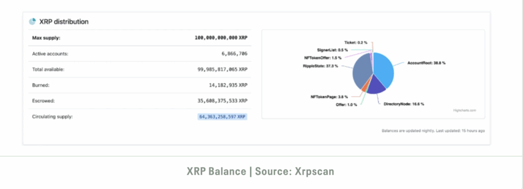 ณ เดือนสิงหาคม 2025 มีเหรียญ XRP หมุนเวียนในตลาดประมาณ 64,000 ล้านโทเค็น ส่วนที่เหลืออีกประมาณ 36,000 ล้านโทเค็น ทาง Ripple ยังคงล็อกไว้ในสัญญา Escrow และจะทยอยปล่อยออกมาเดือนละ 1,000 ล้านโทเค็น ตามเงื่อนไขของสัญญา smart contract ซึ่งการบริหารจัดการการกระจายเหรียญนี้ ถือเป็นปัจจัยสำคัญที่ส่งผลต่ออุปทานและราคาของ XRP ในตลาด