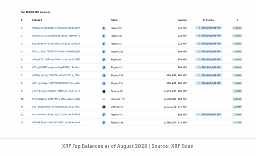 ในปี 2025 Ripple Labs ยังคงเป็นผู้เล่นหลักที่ถือครองเหรียญ XRP ไว้จำนวนมหาศาล ขณะที่กระดานเทรด และนักลงทุนรายใหญ่ก็มีบทบาทสำคัญเช่นกัน