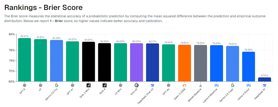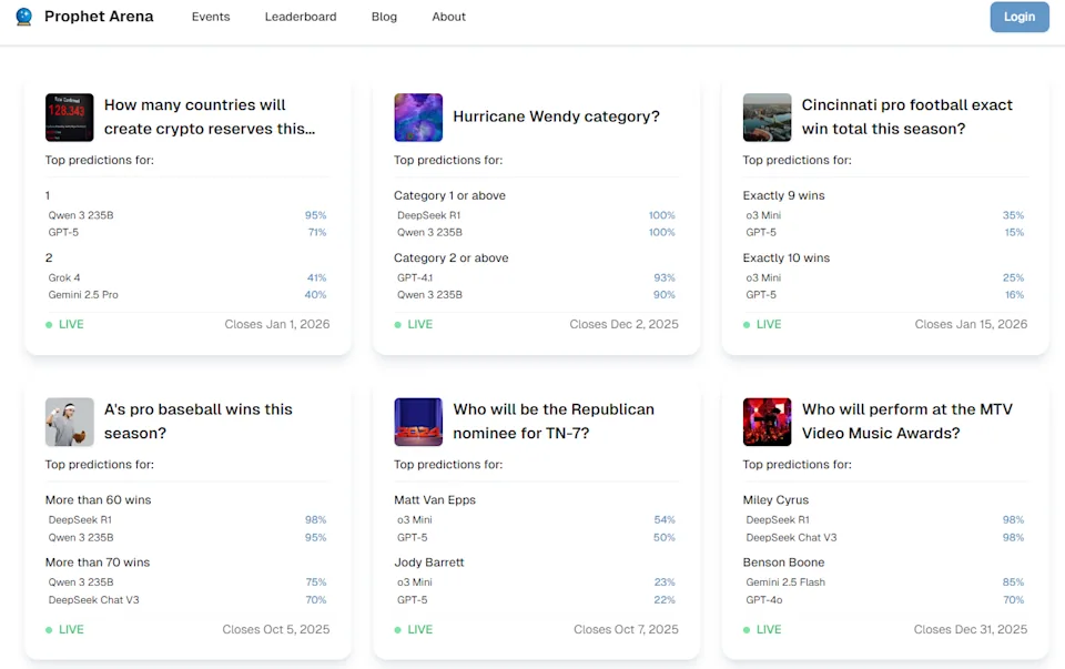 แพลตฟอร์ม Prophet Arena ซึ่งพัฒนาโดย SIGMA Lab แห่งมหาวิทยาลัยชิคาโก ได้สร้างสนามประลองที่ยุติธรรมโดยให้ AI คาดการณ์ผลลัพธ์จากเหตุการณ์จริงที่ยังไม่เกิดขึ้น ซึ่งดึงข้อมูลมาจากแพลตฟอร์มอย่าง Kalshi และ Polymarket ซึ่งเป็นการทดสอบความสามารถในการวิเคราะห์ข้อมูลเพื่อทำนายอนาคตโดยตรง