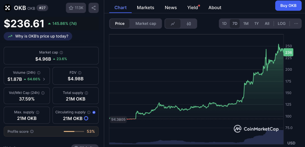 นอกเหนือจากนั้นพวกเขายังมีแผนที่จะนำ OKB ไปเป็นเหรียญค่าแก๊สสำหรับบล็อกเชน Xlayer ของพวกเขาที่เป็น layer 2 บน Ethereum ทำให้ความนิยมในเหรียญดังกล่าวพุ่งอย่างไม่หยุด และในสัปดาห์นี้ก็พุ่งขึ้นมาแล้วกว่า 147%