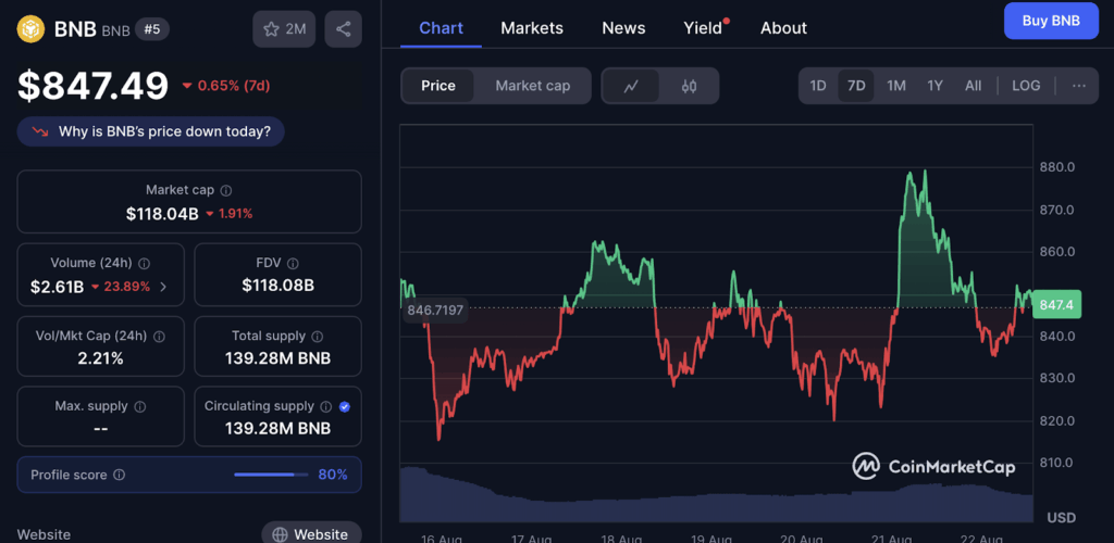 อย่างไรก็ตาม ปัจจุบันราคาของ BNB เริ่มมีการปรับตัวลดลงมาที่ 847 ดอลลาร์หลังจากที่นักลงทุนแห่เทขายเพราะสามารถทำสถิติสูงสุดใหม่