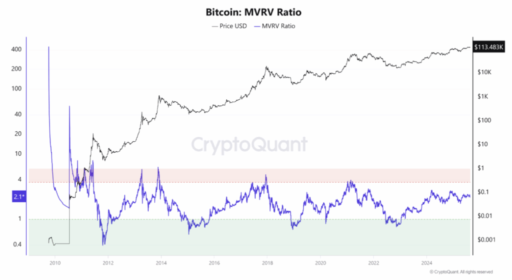 นักวิเคราะห์จาก CryptoQuant ได้ชี้ให้เห็นว่า วัฏจักรของตลาดกระทิงอาจยังไม่จบลง ด้วยการดูจากตัวชี้วัดที่เรียกว่า “MVRV Ratio” ซึ่งเป็นการเปรียบเทียบมูลค่าตลาดรวมกับมูลค่าที่แท้จริงของ Bitcoin
