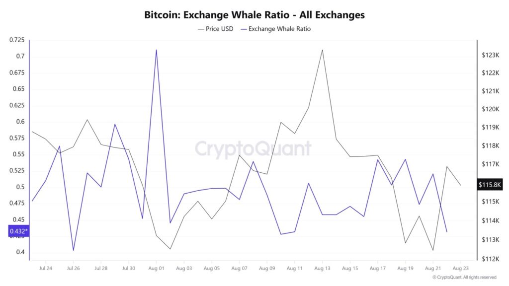 อีกหนึ่งปัจจัยหนุนราคาคือการเคลื่อนไหวของวาฬ ข้อมูลของ CryptoQuant ระบุว่า Exchange Whale Ratio ลดลงแตะ 0.43ซึ่งเป็นระดับต่ำสุดในรอบ 12 วัน แสดงถึงการย้าย Bitcoin เข้ากระดานเทรดมีปริมาณน้อยลง