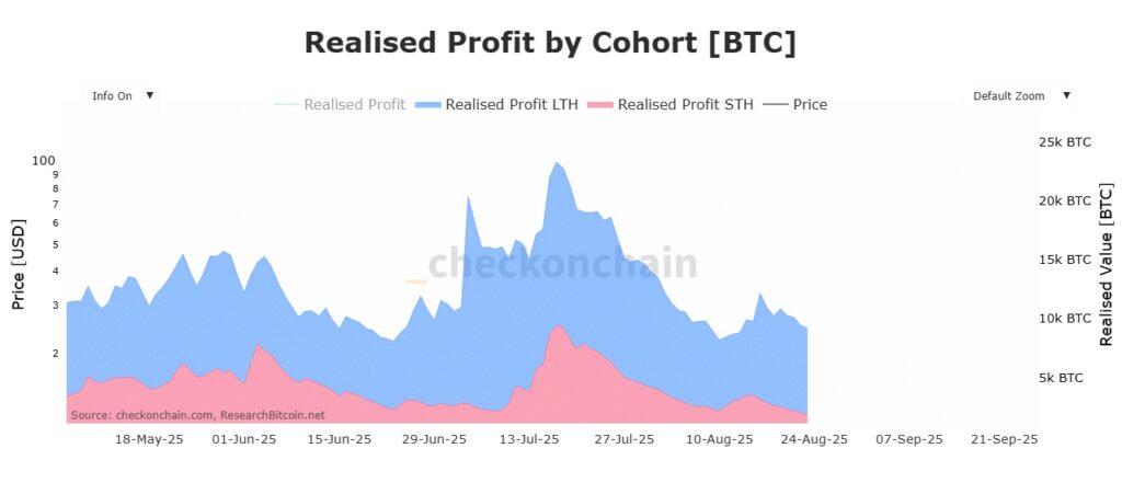 แม้ราคาจะฟื้น แต่ข้อมูล Realized profits ก็ลดลงเช่นกัน โดยผู้ถือครองระยะยาวมีกำไรเพียง 7,200 BTCและผู้ถือระยะสั้นเพียง 1,800 BTC